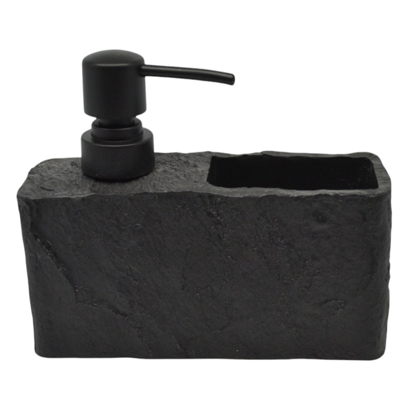 Κομψό dispenser υγρού σαπουνιού από ανθεκτικό πολυεστερικό υλικό με φυσική υφή πέτρας. Διαθέτει ενσωματωμένη θήκη για αποθήκευση μικρών αντικειμένων και αντλία με ματ φινίρισμα για μοντέρνα αισθητική.Ιδανικό για πρακτική οργάνωση στο μπάνιο ή την κουζίνα.