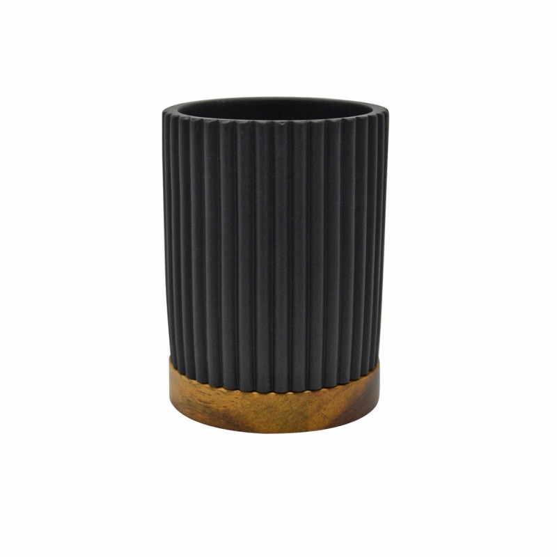 Ποτηροθήκη για οδοντόβουρτσες πολυεστερική σε μαύρο χρώμα με διακόσμηση ανάγλυφες γραμμές και ξύλο ακακίας στο κάτω μέρος. Αξεσουάρ μπάνιου εξαιρετικής ποιότητας με μοντέρνο και κομψό σχεδιασμό. Συνδυάστε τα ιδανικά με αντικείμενα της υπόλοιπης σειράς.