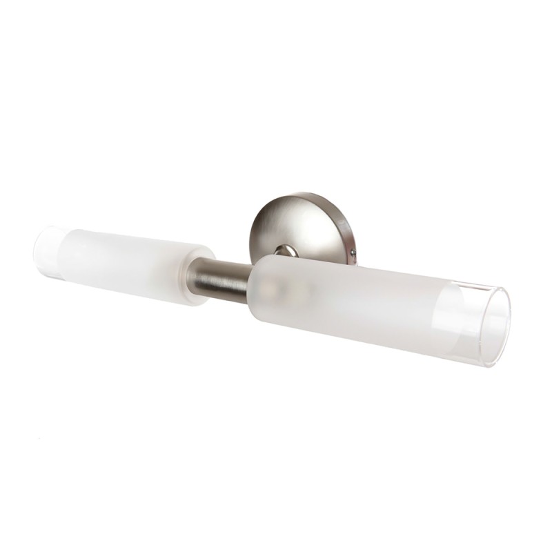 Πρόκειται για ένα επιτοίχιο φωτιστικό κατασκευασμένο από μέταλλο σε νίκελ ματ απόχρωση με δύο λαμπτήρες που καλύπτονται από κυλινδρικό γυαλί αμμοβολής με διάφανες λεπτομέρειες. Είναι η ιδανική επιλογή για φωτισμό μπάνιου τοποθετημένο πάνω από τον καθρέπτη αφού το φως διαχέεται ομοιόμορφα.