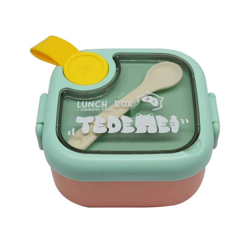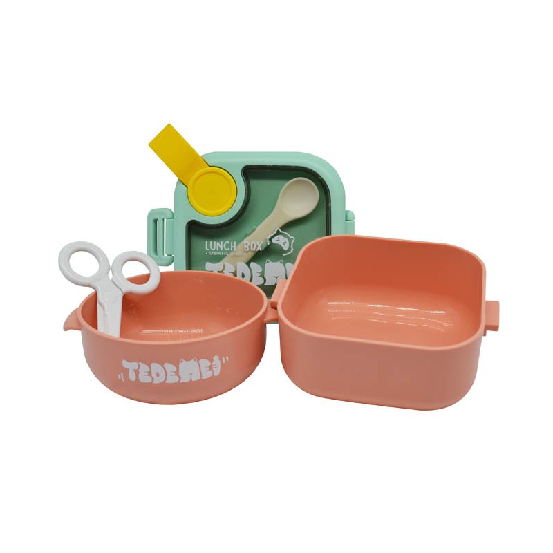 Φαγητοδοχείο διπλό πλαστικό,στρογγυλό το εσωτερικό δοχείο κ τετράγωνο το εξωτερικό σε ροζ χρώμα. Διαθέτει πλαστικό καπάκι ασφαλείας,αεροστεγές κλείσιμο για να διατηρεί φρέσκο το φαγητό κ βαλβίδα αφαίρεσης αέρα.Στο καπάκι υπάρχει θήκη με κουτάλι κ ψαλίδι.
