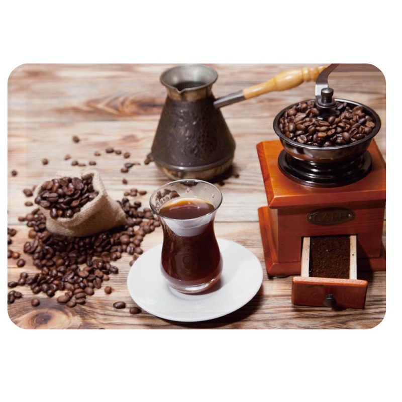 Δίσκος σερβιρίσματος από μελαμίνη, ορθογώνιος με σχέδιο μια σκηνή παραδοσιακού καφέ με μπρίκι, φλιτζάνι, ξύλινο μύλο και κόκκους καφέ, με ματ φινίρισμα. Οι δίσκοι από μελαμίνη είναι ιδιαίτερα χρηστικοί, ανθεκτικοί και κατάλληλοι για τη χρήση σε φαγητό.