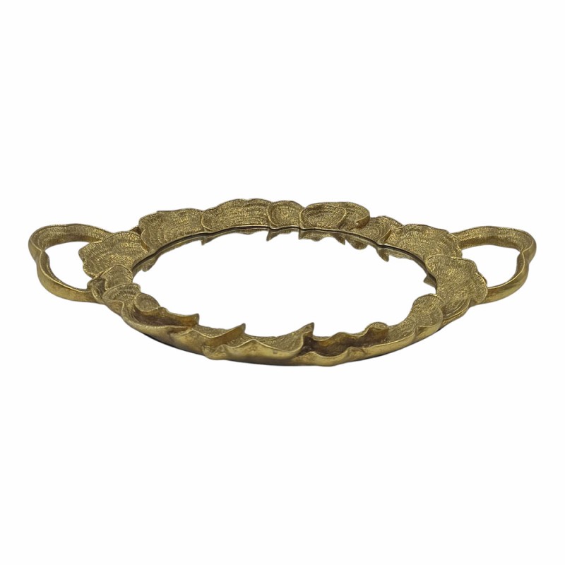 Δίσκος σε χρυσό χρώμα, με ανάγλυφο σχέδιο και κομψές λαβές. Το καμπυλωτό σχήμα και οι λεπτομέρειες του δίνουν έναν ρουστίκ αλλά και εκλεπτυσμένο χαρακτήρα, καθιστώντας τον ιδανικό για διακοσμητική χρήση σε τραπέζια ή για την παρουσίαση μικρών αντικειμένων