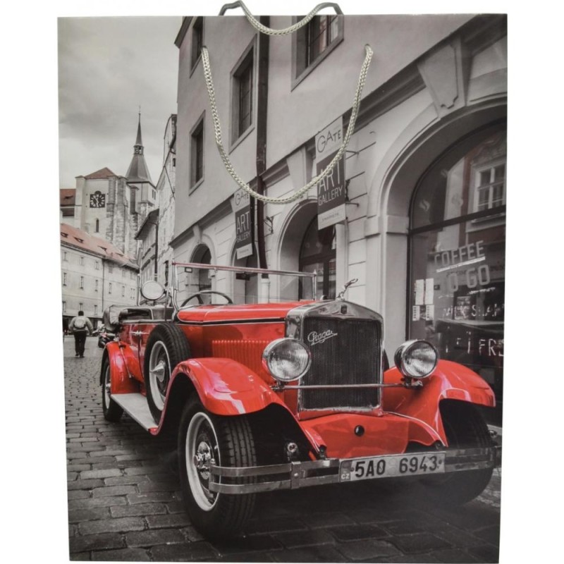 Χάρτινη τσάντα δώρου υψηλής ποιότητας διακοσμημένη με αυτοκίνητο αντίκα σε κόκκινο χρώμα και κορδόνι για χερούλι