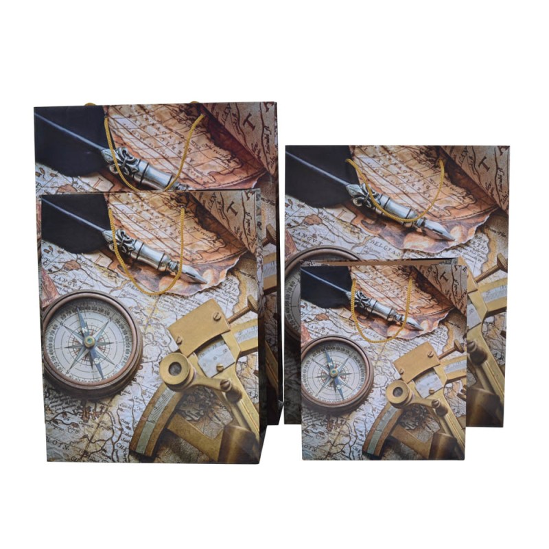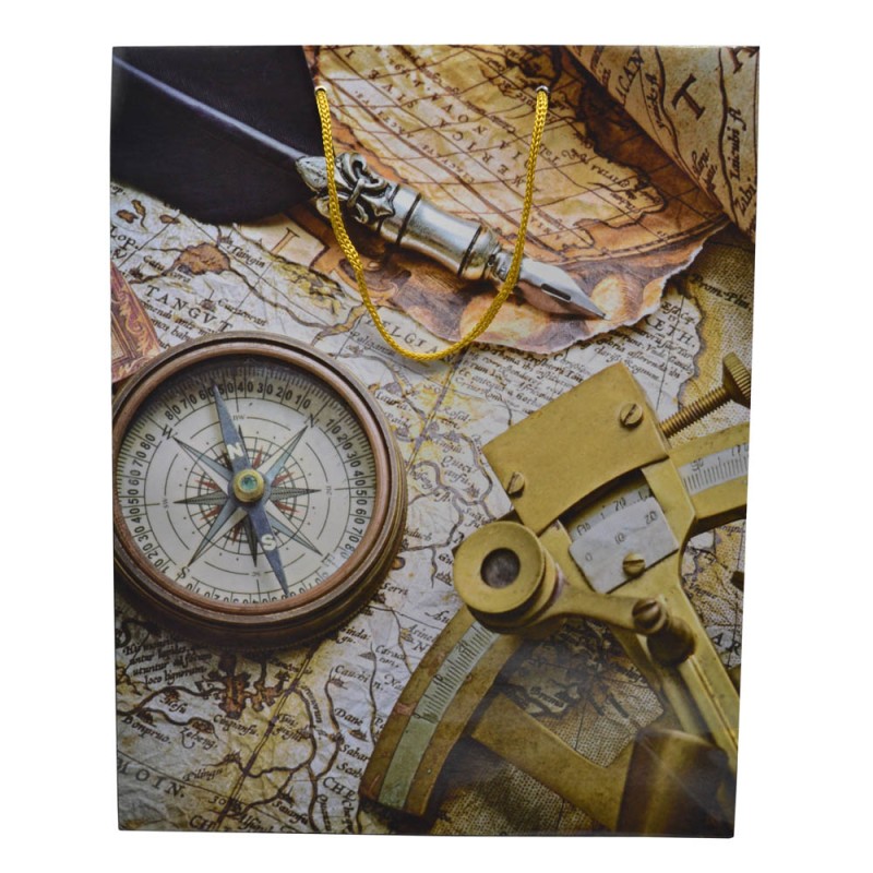 Χάρτινη τσάντα δώρου με πλαστικοποίηση υψηλής ποιότητας, σχέδιο πυξίδα και χάρτες, και χειρολαβή με μπεζ κορδόνι.
