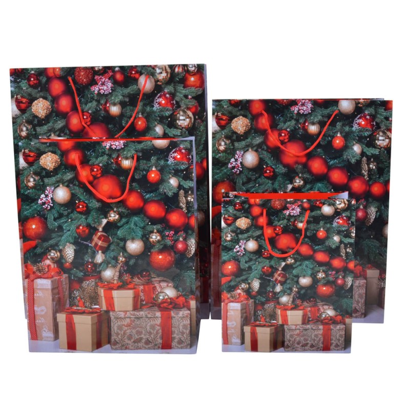 Χάρτινη τσάντα δώρου με πλαστικοποίηση υψηλής ποιότητας, σχέδιο χριστουγεννιάτικες μπάλες και δώρα και χειρολαβή με κόκκινο κορδόνι.