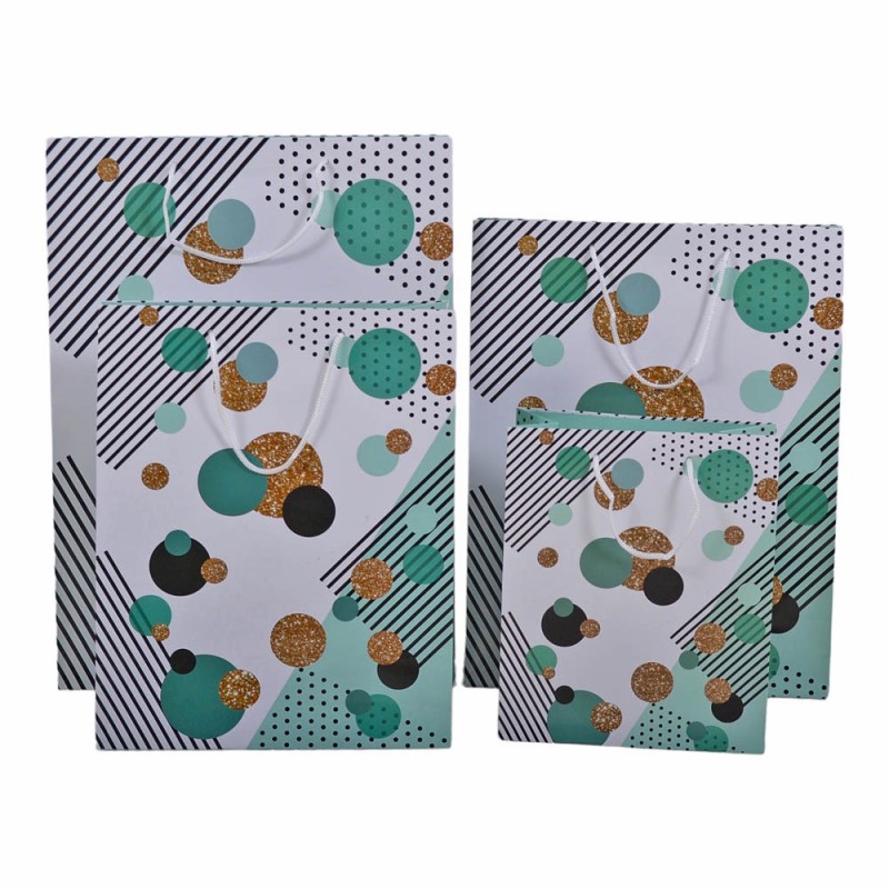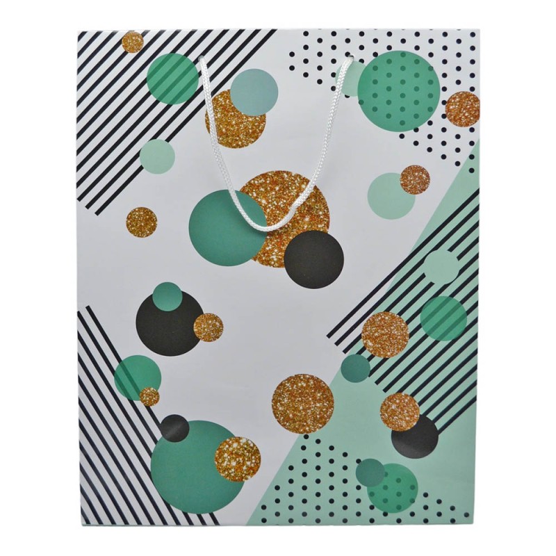 Χάρτινη τσάντα δώρου με πλαστικοποίηση υψηλής ποιότητας, σχέδιο κύκλους σε πετρόλ και χρυσό χρώμα και χειρολαβή με κορδόνι.