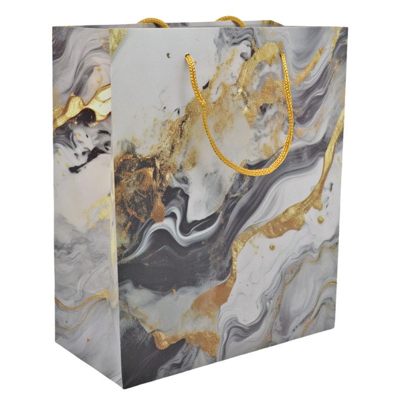 Χάρτινη τσάντα δώρου με ματ πλαστικοποιημένο φινίρισμα υψηλής ποιότητας, μαρμάρινο σχέδιο και κομψή χειρολαβή από κορδόνι.