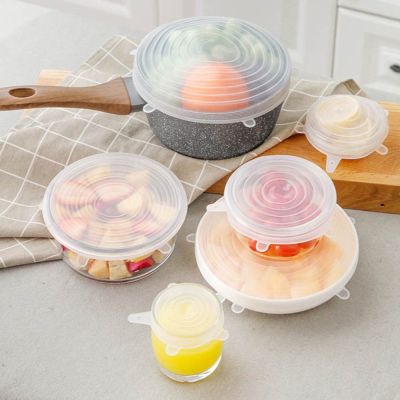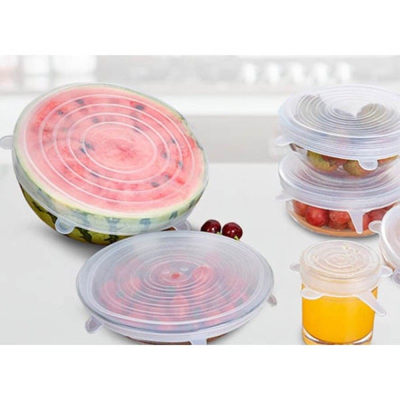 Σετ 6 τμχ ελαστικά καπάκια σιλικόνης κατάλληλα για τρόφιμά. Κρατήστε τα φαγητά σας φρέσκα και αποφύγετε τις οσμές και τις μεμβράνες με τη βοήθεια των καπακιών. Είναι ελαστικά για να μπορούν να τοποθετηθούν σε διαφορετικά μπολ, πιάτα ή και σε τρόφιμα.