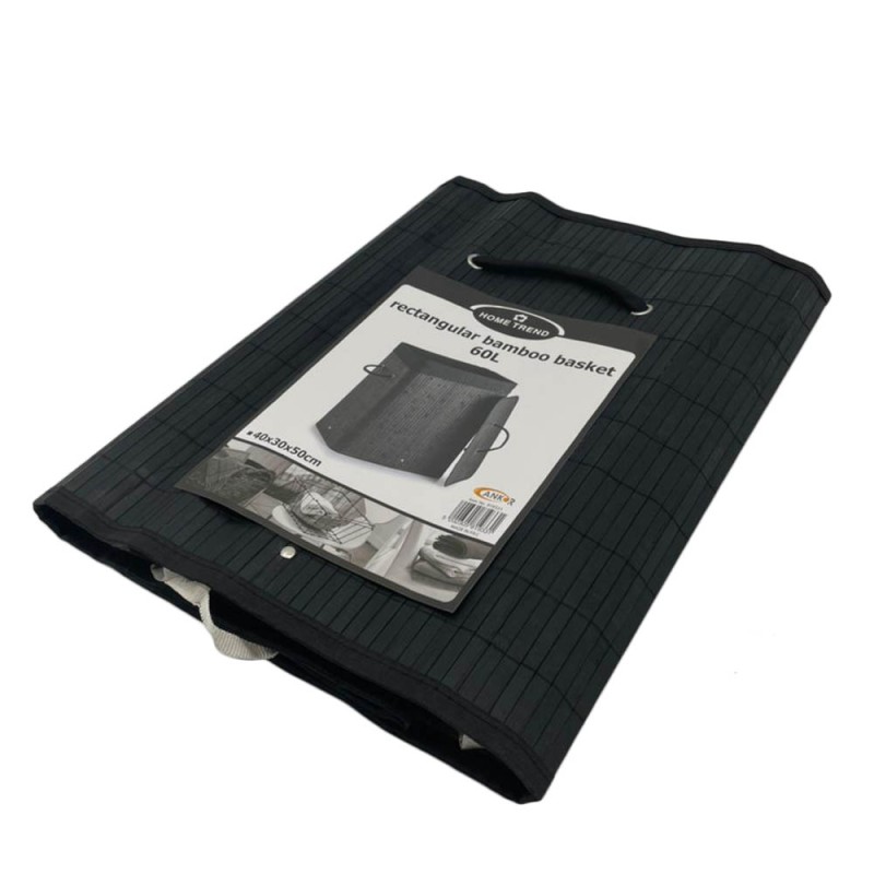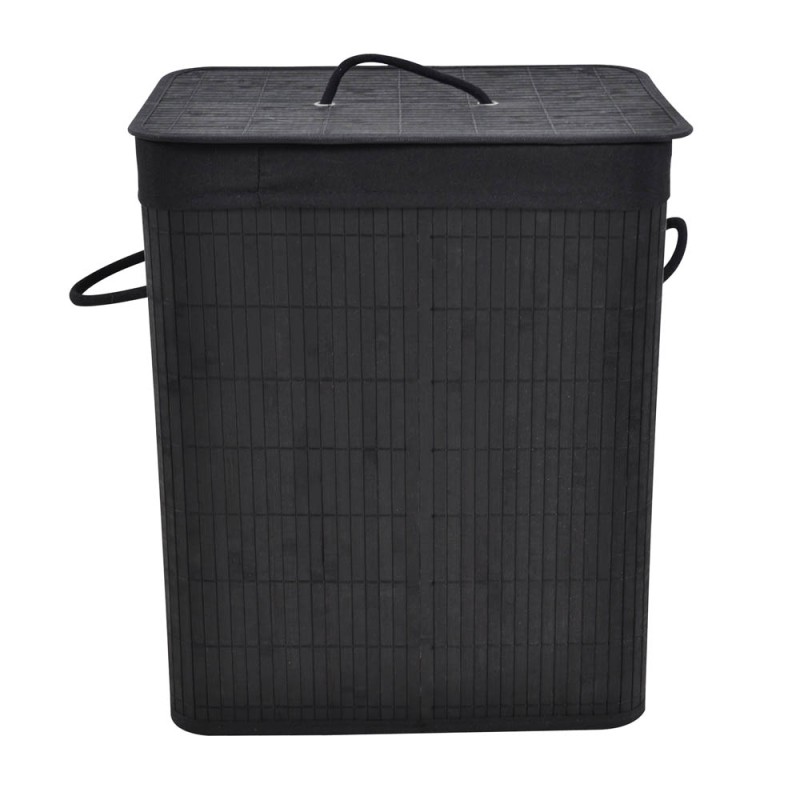 Καλάθι άπλυτών με καπάκι, από ξύλο μπαμπού σε μαύρο χρώμα, ιδιαίτερα ανθεκτικό στον χρόνο και αφαιρούμενο σάκο.H σύνθεση του υφάσματος είναι από βαμβακερό λινό κ πολυεστέρα.Είναι αναδιπλούμενο για εύκολη αποθήκευση και διαθέτει λαβές για εύκολη μεταφορά.