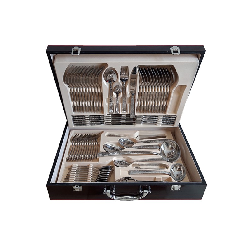 Μαχαιροπίρουνα από ανοξείδωτο ατσάλι 18/10 διατίθενται σε πολυτελή βαλίτσα των 72 τεμαχίων. Τα μαχαιροπίρουνα έχουν μεγάλη αντοχή, δεν φθείρονται εύκολα και είναι ανθεκτικά στο πλυντήριο πιάτων.Το σετ αποτελείται:12 μαχαίρια φαγητού12 πιρούνια φαγητού12 κουτάλια φαγητού12 πιρουνάκια γλυκού12 κουταλάκια γλυκού1 κουτάλα σούπας1 κουτάλι σάλτσας1 ζεύγος σαλάτας2 κουτάλια σερβιρίσματος1 σπάτουλα1 λαβίδα2 πιρούνια σερβιρίσματος1 κουτάλι μουστάρδας1 κουτάλι κρέμας