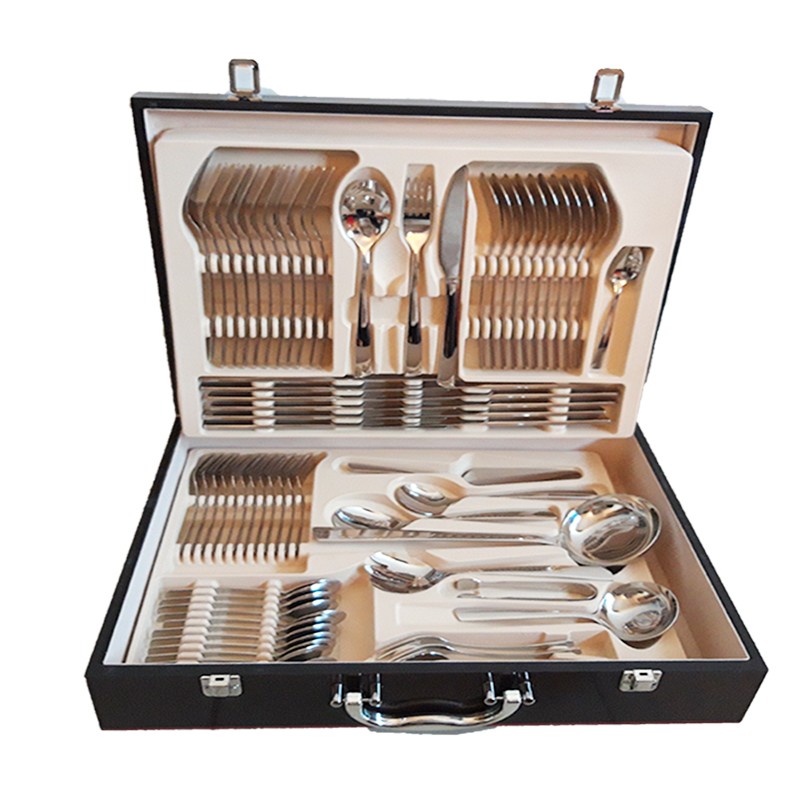 Μαχαιροπίρουνα από ανοξείδωτο ατσάλι 18/10 διατίθενται σε πολυτελή βαλίτσα των 72 τεμαχίων. Τα μαχαιροπίρουνα έχουν μεγάλη αντοχή, δεν φθείρονται εύκολα και είναι ανθεκτικά στο πλυντήριο πιάτων.Το σετ αποτελείται:12 μαχαίρια φαγητού12 πιρούνια φαγητού12 κουτάλια φαγητού12 πιρουνάκια γλυκού12 κουταλάκια γλυκού1 κουτάλα σούπας1 κουτάλι σάλτσας1 ζεύγος σαλάτας2 κουτάλια σερβιρίσματος1 σπάτουλα1 λαβίδα2 πιρούνια σερβιρίσματος1 κουτάλι μουστάρδας1 κουτάλι κρέμας