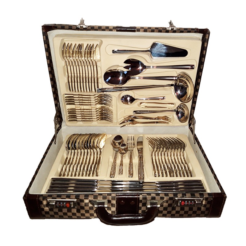 Μαχαιροπίρουνα από ανοξείδωτο ατσάλι 18/10 διατίθενται σε πολυτελή βαλίτσα των 72 τεμαχίων. Τα μαχαιροπίρουνα έχουν μεγάλη αντοχή, δεν φθείρονται εύκολα και είναι ανθεκτικά στο πλυντήριο πιάτων.Το σετ αποτελείται:12 μαχαίρια φαγητού12 πιρούνια φαγητού12 κουτάλια φαγητού12 πιρουνάκια γλυκού12 κουταλάκια γλυκού1 κουτάλα σούπας1 κουτάλι σάλτσας1 ζεύγος σαλάτας2 κουτάλια σερβιρίσματος1 σπάτουλα1 λαβίδα2 πιρούνια σερβιρίσματος1 κουτάλι μουστάρδας1 κουτάλι κρέμας