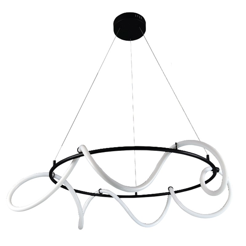 Πρόκειται για ένα κρεμαστό φωτιστικό με αφαιρετική σχεδίαση. Το μαύρο μέταλλο συμπληρώνει τον led φωτιζόμενο και εύκαμπτο σωλήνα θερμής απόχρωσης. Το φως διαχέεται σε όλον τον χώρο και η ανάρτησή του είναι ρυθμιζόμενη. Διακοσμεί ιδανικά οποιονδήποτε μοντέρνο εσωτερικό χώρο.