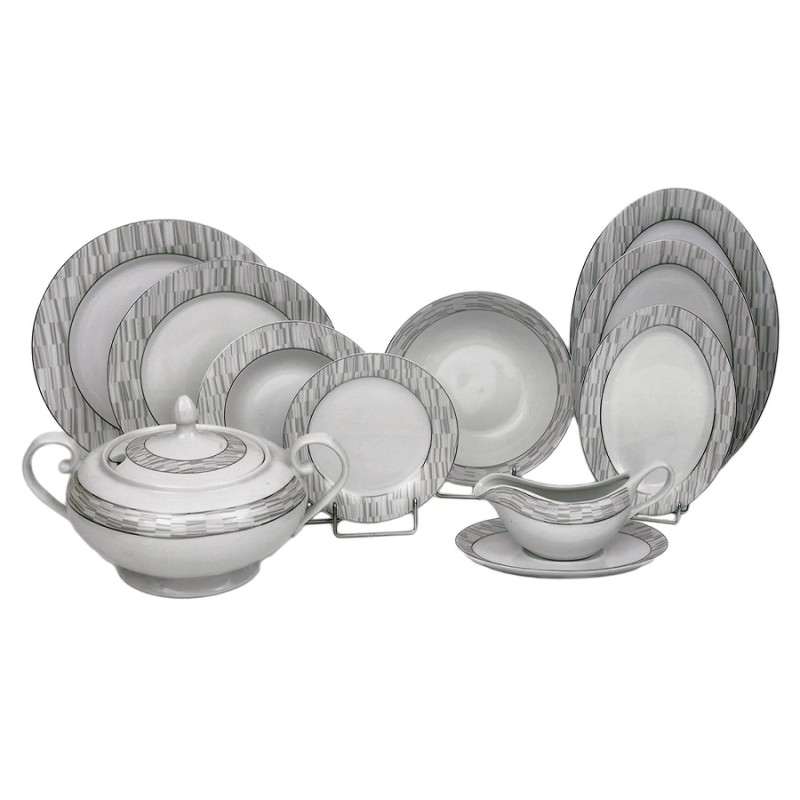 Σερβίτσιο φαγητού 72 τεμαχίων από υψηλής ποιότητας πορσελάνης με διακριτικά σχέδια Platin Stripes.Το σετ αποτελείται: 24 Πιάτα ρηχά 27cm 12 Πιάτα βαθιά 22cm 24 Πιάτα πάστας 19cm 4 Ραβιέρες 25cm 1 Πιατέλα οβάλ μεγάλη 35cm 2 Πιατέλες οβάλ 31cm 1 Πιατέλα στρογγυλή 30cm 2 Σαλατιέρες 25cm 1 Σαλτσιέρα 21cm 1 Σουπιέρα 31cm