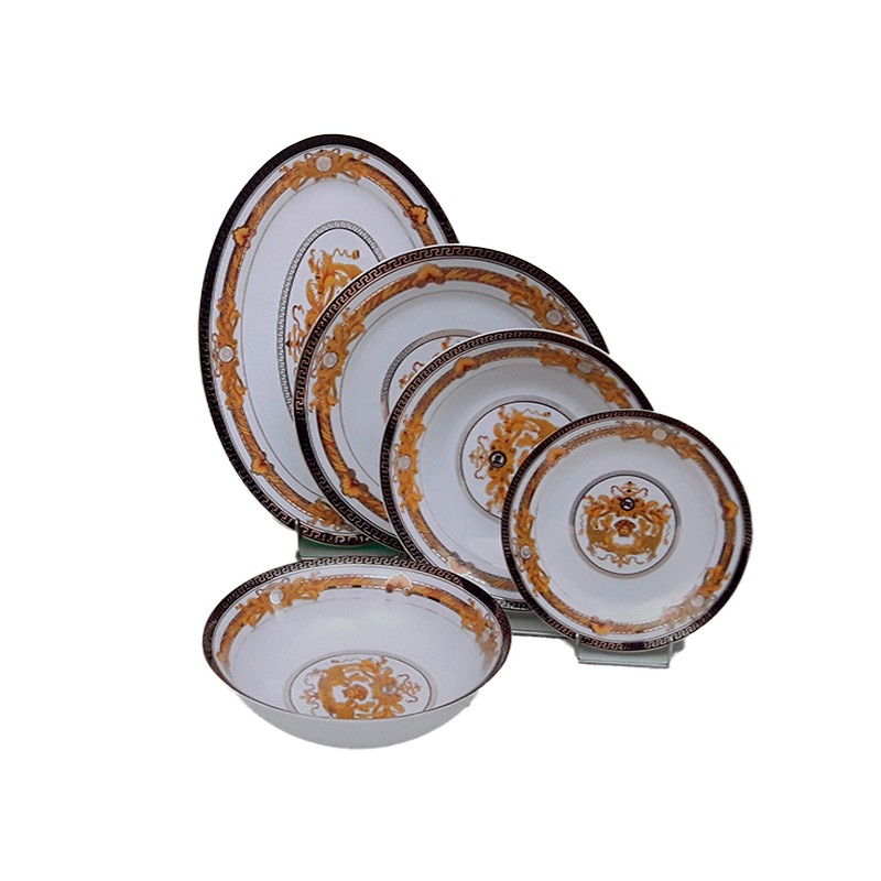 Σερβίτσιο φαγητού 20 τεμαχίων από υψηλής ποιότητας πορσελάνης, με κλασικό μπαρόκ σχέδιο σε μια πλούσια χρυσή - λευκή απόχρωση.1 Πιατέλα1 Σαλατιέρα6 Πιάτα Βαθιά6 Πιάτα Ρηχά6 Πιάτα Φρούτου, Το συγκεκριμένο σχέδιο διατίθεται σε σετ τσαγιού/καφέ και σετ πάστας.