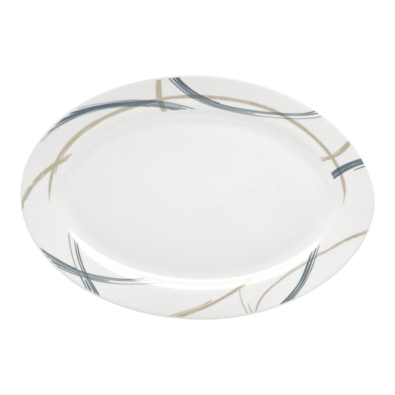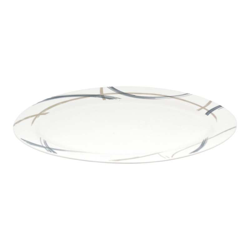 Πιατέλα από πορσελάνη υψηλής ποιότητας, διαμέτρου 30,5 εκ., ιδανική για καθημερινό σερβίρισμα. Το διακριτικό της σχέδιο με καμπύλες γραμμές σε βαθύ μπλε και μπεζ αποχρώσεις προσθέτει μοντέρνα αισθητική στο τραπέζι. Κατασκευασμένη από ανθεκτική πορσελάνη για μεγάλη διάρκεια ζωής και ευκολία στο καθάρισμα. Κατάλληλη για χρήση στο πλυντήριο πιάτων και στον φούρνο μικροκυμάτων.