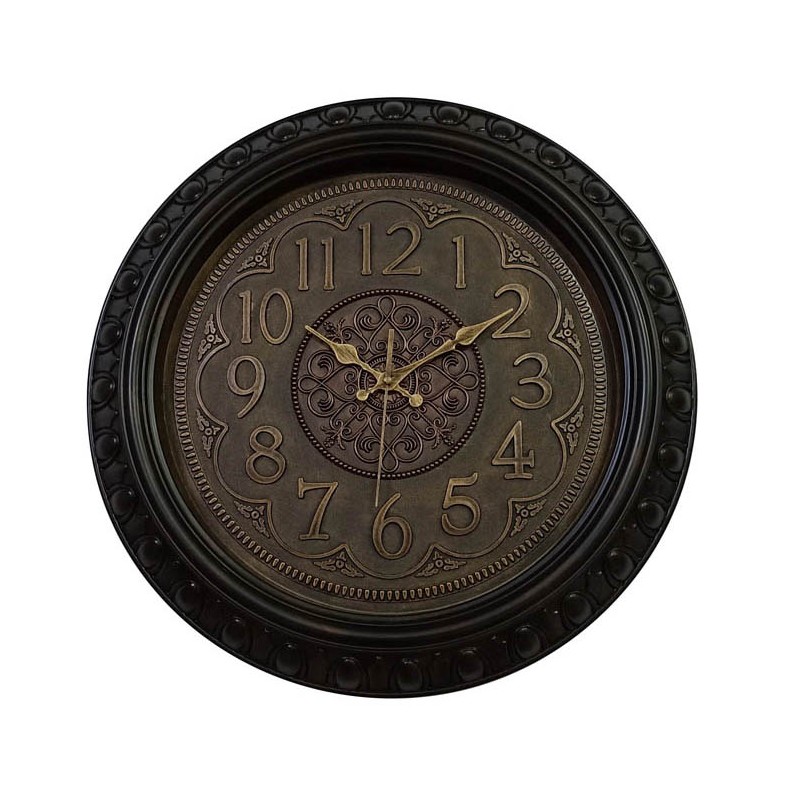 Ρολόι τοίχου πλαστικό σε σκούρο καφέ χρώμα με διακριτική διακόσμηση στο πλαίσιο, το οποίο διαθέτει γυαλί στο μπροστινό μέρος και αθόρυβο μηχανισμό.