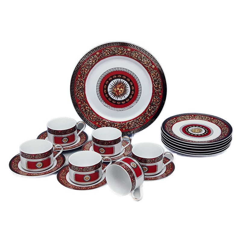 Σερβίτσιο πάστας 7 τεμαχίων από υψηλής ποιότητας πορσελάνης, με κλασικό μπαρόκ σχέδιο σε μια πλούσια χρυσή -κόκκινη απόχρωση.Το σετ αποτελείται: 1 πιατέλα 6 πιάτα πάστας. Το συγκεκριμένο σχέδιο διατίθεται σε Σερβίτσιο φαγητού 20 τεμαχίων και σε Σετ Τσαγιού.