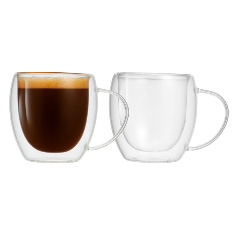 Σετ 2 φλιτζάνια διπλού τοιχώματος από βοριοπυριτικό γυαλί, χωρητικότητας 150 ml, ιδανικά για καφέ, τσάι ή ροφήματα. Το βοριοπυριτικό γυαλί ξεχωρίζει για την υψηλή αντοχή του στις θερμοκρασιακές μεταβολές, προσφέροντας ασφαλή και ανθεκτική χρήση. Το διπλό τοίχωμα διατηρεί τη θερμοκρασία του ροφήματος για περισσότερη ώρα, ενώ προστατεύει το χέρι από τη θερμότητα, συνδυάζοντας πρακτικότητα με κομψή αισθητική.