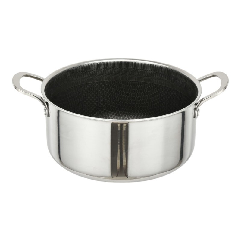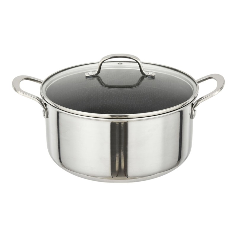 Κατσαρόλα από ανοξείδωτο ατσάλι 18/8 πάχους 2,5mm τριών στρώσεων με αντικολλητική επίστρωση. Διαθέτει γυάλινο καπάκι, είναι ανθεκτική στις γρατζουνιές και εξασφαλίζει ομοιόμορφη κατανομή θερμότητας. Κατάλληλη για όλες τις εστίες και για πλυντήριο πιάτων.