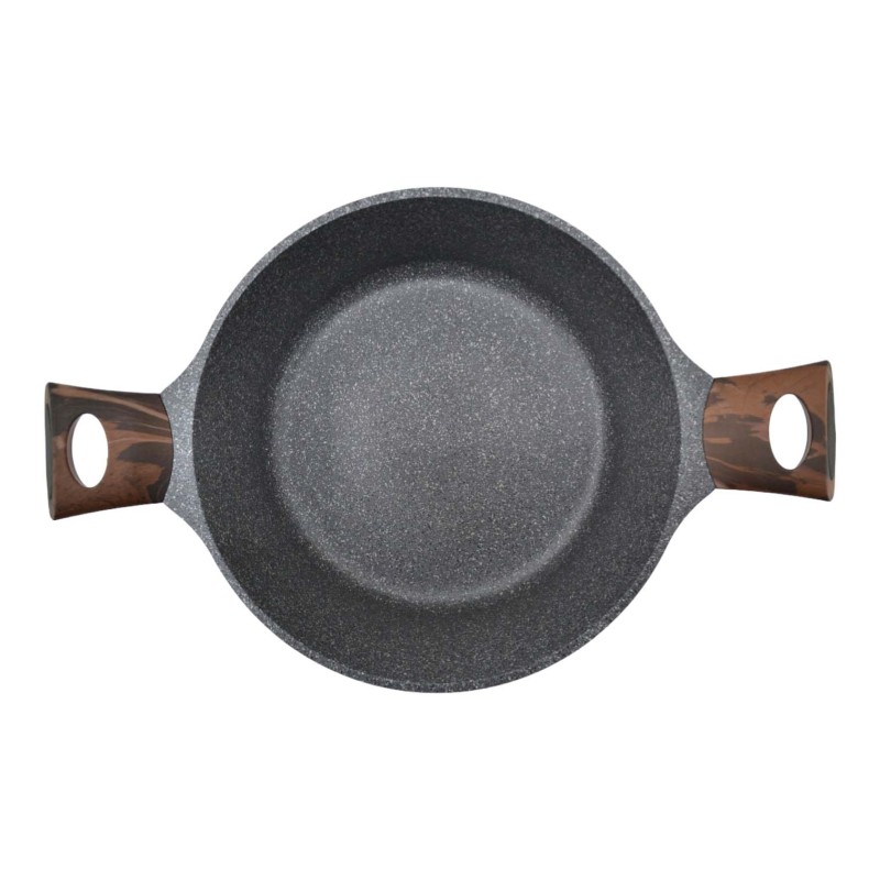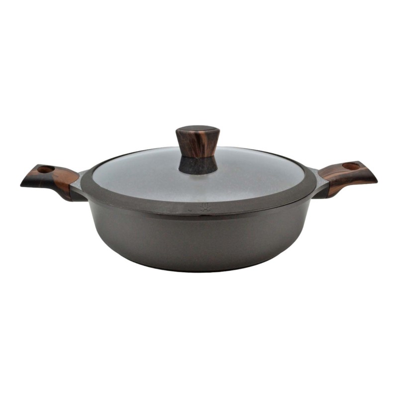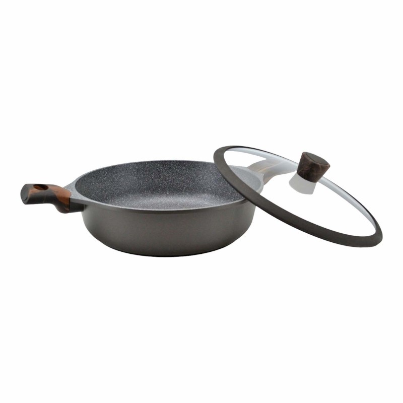 Σωτέζα αλουμινίου με τριπλή αντικολλητική επίστρωση πέτρας κ αντοχή σε υψηλές θερμοκρασίες κ γδαρσίματα. Διαθέτει βιομηχανικό πάτο, γυάλινο καπάκι με σιλικόνη κ λαβές από βακελίτη soft touch.Είναι κατάλληλη για όλες τις εστίες κ για το πλυντήριο πιάτων.